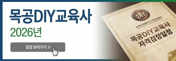 협회소개 인사말 설립목적 및 근거 주요사업 임원 연혁 찾아오시는길 협회회원 협회특별회원 협회 협력사 현황 목공DIY교육사 목공DIY교육사 자격개요 목공DIY교육사 강사현황 2026 자격검정일정 협회지정교육기관 교육기관 지정절차 교육기관 현황 맞춤형 목공 프로그램 협회소식 공지사항 목공DIY교육사공지 유관기관&회원사 참여마당 자유게시판 자료실 전국공방주소